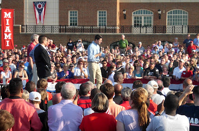 “Granted, as an alum, Paul Ryan could expect a nice crowd at Miami U; but what’s really amazing is that most freshmen don’t move in until tomorrow and most upperclassmen not until the weekend. Given Miami’s bucolic, rural setting (i.e. in the middle of nowhere), I imagine most of those folks drove at least 30 minutes from Dayton or Cincinnati.”