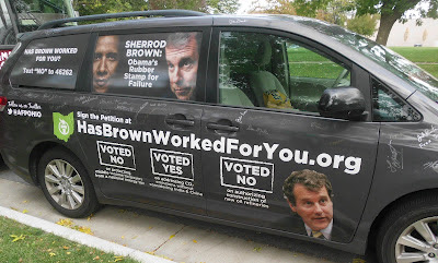 When people drive past the bus, they often honk to show their support. The bus is also accompanied by the “Has Brown Worked For You” van, highlighting the record of Ohio Sen. Sherrod Brown.