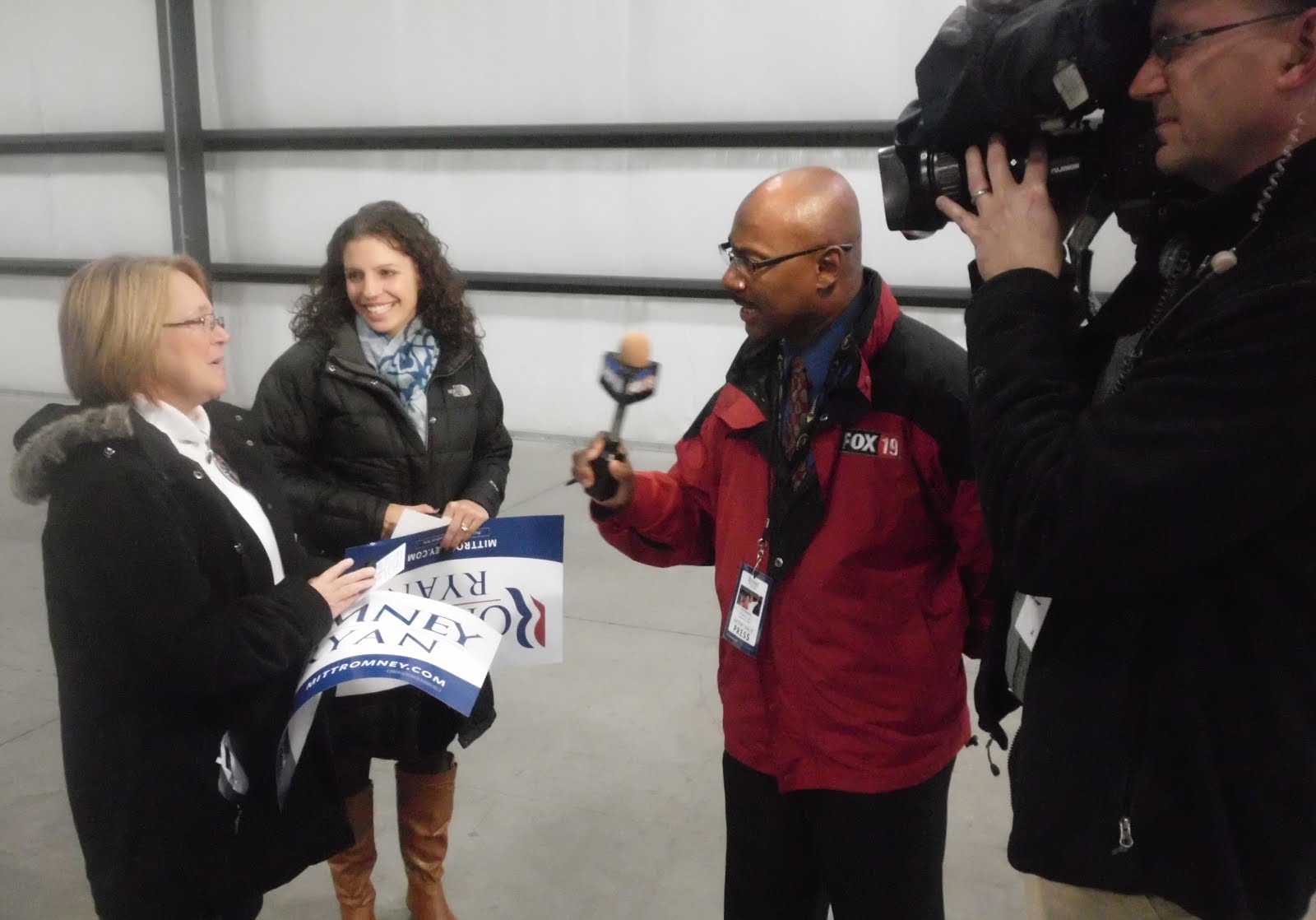 Lilly Ann Baker, 7, is interviewed by the local ABC affiliate, while her mother Andrea Baker watches. Lilly Ann is a second-grader at Riverview Elementary, which is kind of young to begin a career as a TV political commentator, but she knows more about Ohio than does Nate Silver.