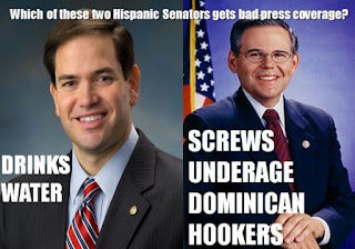 - Why can’t the Post be bothered to do any investigating of its own? Forget partisan bias and just think what a huge story this could be: Top senator on the Foreign Relations Committee partying down with jailbait prostitutes in the seaside resort mansion owned by his shady Florida contributor? There’s got to be at least a book contract, and maybe a major motion picture deal, for the journalist who can get the scoop on a juicy scandal like that. And if you’re a reporter for the Washington Post, would you rather be stuck inside a fluorescent-lit office in D.C., or flying off at company expense to the Dominican Republic to interview prostitutes? Did I mention prostitution is legal in the Dominican Republic?