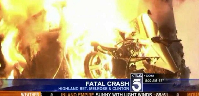 No. The NSA does not have technology that can make a sports car veer out of control. But Budweiser does. As does the intersection of Highland and Melrose. It’s called an elevation in the road. These sorts of objects have been known to send cars airborne, careening out of control. Also there is a picture of the crash with the gas tank visibly detached from the vehicle. So one can only imagine how much fuel was dispersed upon the scene.