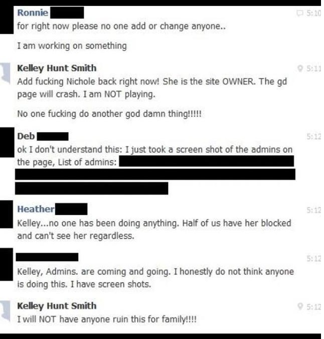 Trying to ride herd on a crew like that wasn’t going to be easy and — surprise! surprise! surprise! — Kaitlyn Hunt’s parents weren’t prepared to deal with that reality, either. So there has been a (predictable) meltdown within the “Free Kate” Facebook group in recent days. Evidently at the urging of Kaitlyn’s lawyer, her mother presented administrators of the page with a confidentiality agreement they were required to sign, and four administrators resigned rather than to sign it. This had terrible repercussions for group morale, among other things, and Kelley Hunt Smith didn’t handle that too well: