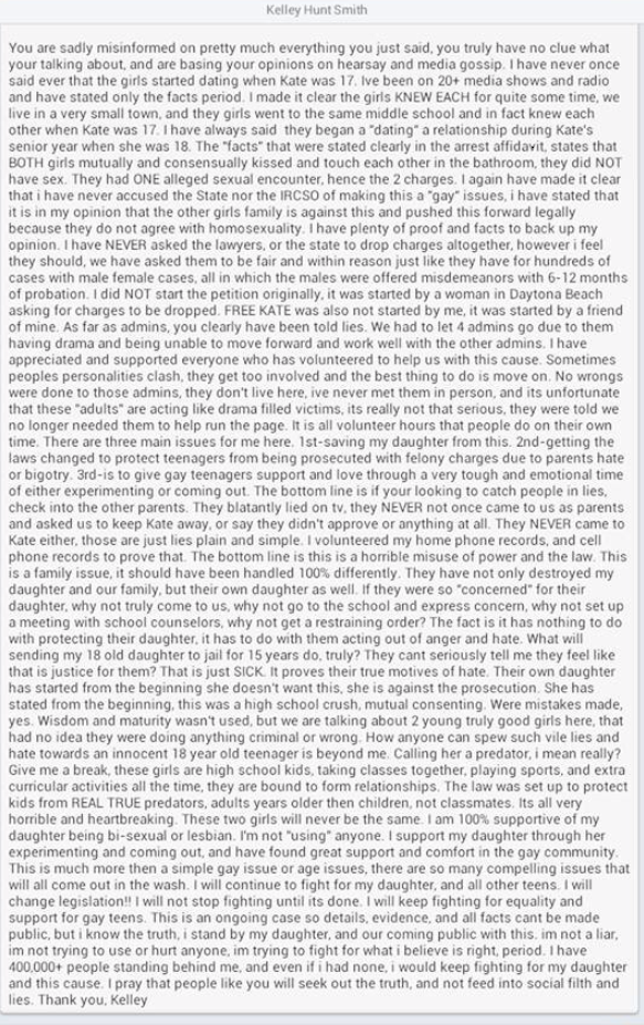 “I have stated that it is in my opinion that the other girl’s family is against this and pushed this forward legally because do not agree with homosexuality. I have plenty of proof and facts to back up my opinion. …”