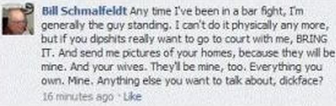 For example, in 2011, Schmalfeldt decided to launch a scorched-earth war of annihilation against a Facebook group that was supporting Wisconsin Gov. Scott Walker against the Democrat/union-backed recall petition campaign. Schmalfeldt was going to expose these Evil Republican Facebookers, you see, because in Schmalfeldt’s demented imagination, they were some kind of criminal conspiracy. And also, I think, some of them may have mocked him as a fat old ridiculous douchebag. (See? They’re evil!) Schmalfeldt once threatened a guy for “liking” a Facebook page that ridiculed Schmalfeldt: