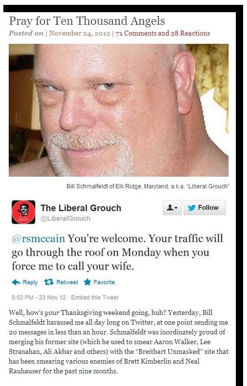 “Pray for Ten Thousand Angels,” I said last November, when Bill Schmalfeldt’s relentless harassment finally escalated to the point that he was threatening to call my wife. That was the first time I ever posted a photo of Schmalfeldt. If you’ve been reading John Hoge’s blog lately, you know that Schmalfeldt filed a “Digital Millennium Copyright Act” notice, claiming Hoge had “stolen” Schmalfeldt’s intellectual property. Schmalfeldt also filed a DMCA notice with our web-hosting company, which is now handled through Ali Akbar’s Pundit Syndication LLC. This is being dealt with appropriately. (Click here to read Ali’s reply.)