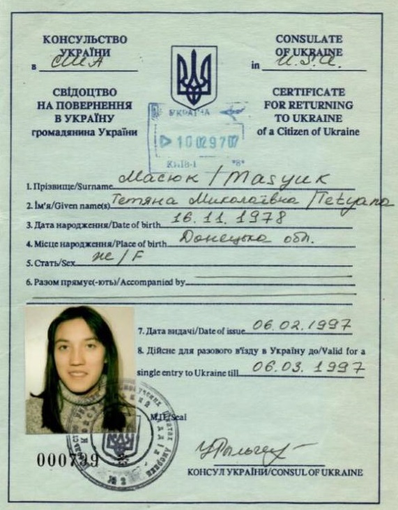 Hoge doesn’t say so, but the obvious inference is that Kimberlin forged documents to conceal his wife’s true age — to show her as 18 rather than 16 — so that he could marry her in Maryland without parental permission. Once you get one fake ID document (e.g., a birth certificate), you can then use that to obtain others, and so it is impossible to know what falsified identification was used to obtain that travel document in June 1997, when Tetyana was still only 16.