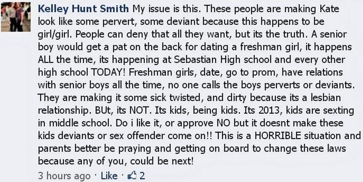 “My issue is this. These people are making Kate look like some pervert, some deviant because this happens to be girl/girl. People can deny that all they want, but its the truth. A senior boy would get a pat on the back for dating a freshman girl, it happens ALL the time, its happening at Sebastian High school and every other high school TODAY! . . .”