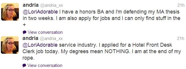 Moose w/a BA/MA in Womyn’s studies and is reduced to applying for “service industry” jobs, #injustice ! thx NicolasK