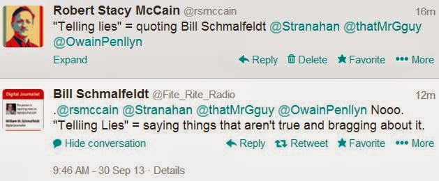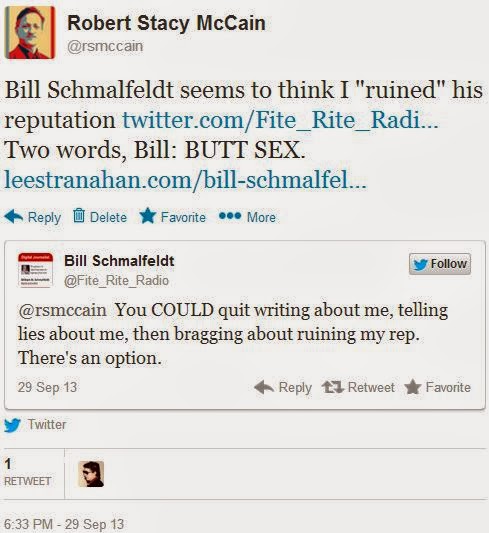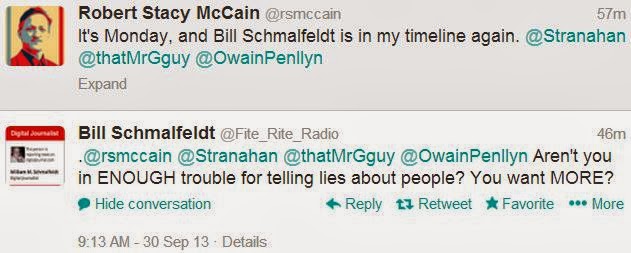 Notice what’s happening here: I remark that Schmalfeldt is “in my timeline” (i.e., sending messages to @rsmccain, so that I see them in my “mentions” queue), but in remarking this, I do not reply to Schmalfeldt: I don’t include his Twitter handle in my message. The only way he could be aware that I have mentioned his name is either (a) by constantly monitoring my timeline, or (b) by searching Twitter for his name. Either one is indicative of obsessive behavior.
