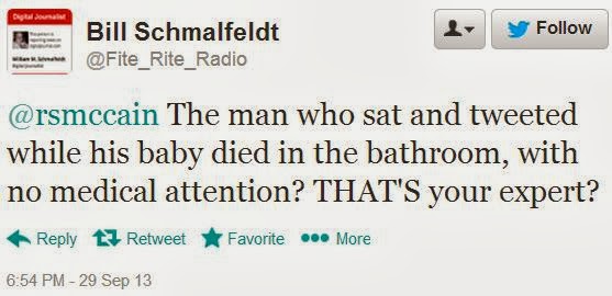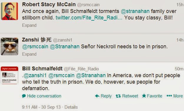 Why would Bill Schmalfeldt do such horrible things? Can he explain, defend or justify this vicious activity? Of course not. It was just evil, sadistic madness. As with the offensive obscenity that got him banished from Daily Kos, whatever damage resulted to Bill Schmalfeldt’s reputation from this hateful harassment of Stranahan was entirely self-inflicted — and yet Bill can’t help himself. His habits of mind are such that, as soon as he saw me tweet that link to Lee Stranahan’s blog, Schmalfeldt started ranting about Stranahan’s dead child.