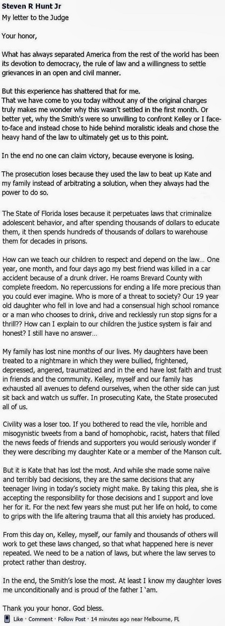 On Facebook, Kaitlyn Hunt’s father Steven R. Hunt Jr. released a bitter statement blaming the prosecution, which he said “used the law to beat up Kate,” the state of Florida (“because it perpetuates laws that criminalize adolescent behavior”) and the Smith family, saying that the victim’s parents “chose to hide behind moralistic ideas.”