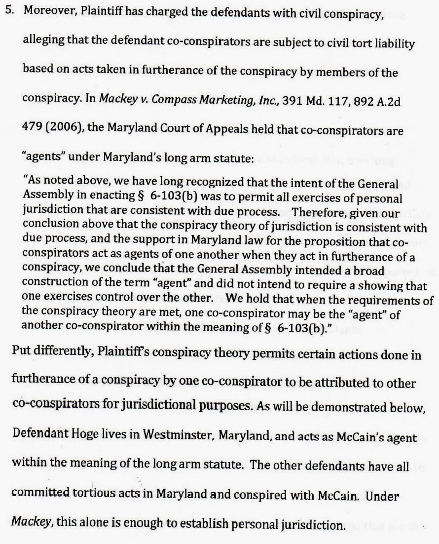 Regular readers know that I moved out of Maryland in mid-2012 to avoid harassment by Brett Kimberlin and his associates. Now, in order to assert that I am subject to the jurisdiction of Maryland courts, Kimberlin asserts (in his own words) a “conspiracy theory” claiming that John Hoge is my “agent” whose actions may be “attributed” to me “in furtherance of a conspiracy.” In other words, Brett Kimberlin alleges I am responsible for Hoge’s actions — that Hoge has acted as my “agent” in Maryland — and Kimberlin claims he can “demonstrate” this as a matter of fact.
