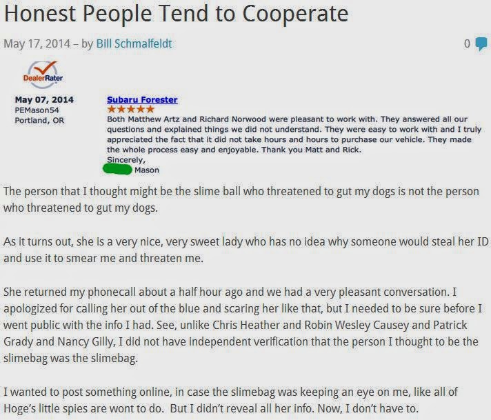 Bill has inflated the importance of his own (self-inflicted) problems and blames these problems on Hoge and on various commenters at Hoge’s blog — Paul Krendler, Robin Causey, etc. — and has taken to “doxing” these people (publishing their personal information) and, by using such materials in his “books,” Schmalfeldt has stirred up trouble for himself with these online self-publishing services.