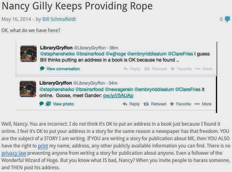 Who is Nancy Gilly? Is she indeed @LibraryGryffon? And why would anyone other than Bill Schmalfeldt care? Bill’s complaints are as nonsensical as his helpless obsession with the “Wonderful Wizard of Hoge,” but this is how pathology becomes identity: Believing himself to be a victim, Schmalfeldt makes his victimhood the basis of his identity, and then interprets everything in that context. But because his victimhood is delusional — his misfortunes are in fact the result of his own actions — his self-created persona of “Victim Bill” is simply a symptomatic manifestation of his derangement.