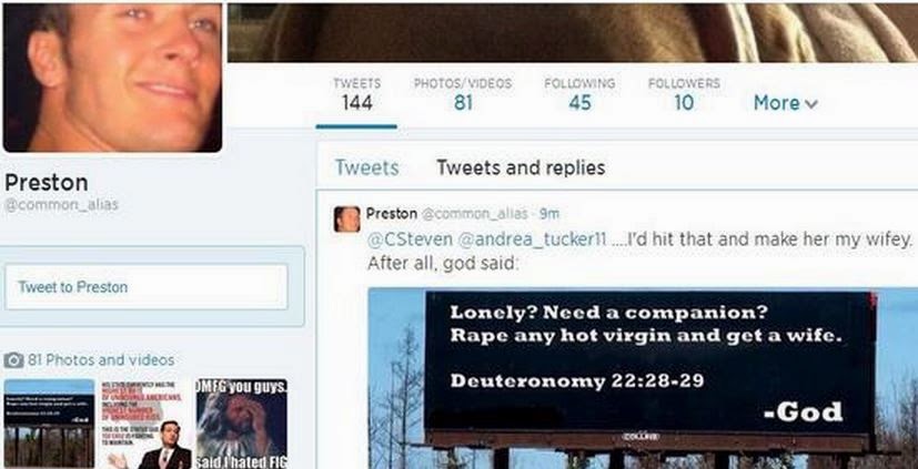 Preston Smith (@common_alias) is an atheist progressive supporter of Hillary Clinton’s incipient 2016 presidential campaign. C. Steven Tucker (@CSteven) is a Chicago businessman, Tea Party activist and ObamaCare critic. Wednesday afternoon, Tucker sent out a Twitter message about calls to impeach President Obama. Smith responded with a sick comment — CC’d to Tucker’s wife Andrea — that appeared to be a rape threat directed at one of their teenage daughters: