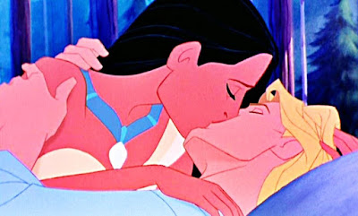 These films repeatedly mark relationships between cross-gender lead characters as special and magical by utilizing imagery of love and romance. Characters in love are surrounded by music, flowers, candles, magic, fire, ballrooms, fancy dresses, dim lights, dancing, and elaborate dinners. Fireflies, butterflies, sunsets, wind, and the beauty and power of nature often provide the setting for — and a link to the naturalness of — hetero-romantic love. For example, in Beauty and the Beast, the main characters fall in love frolicking in the snow; Aladdin and Jasmine fall in love as they fly through a starlit sky in Aladdin; Ariel falls in love as she discovers the beauty of earth in The Little Mermaid; . . . Pocahontas is full of allusion to water, wind, and trees as a backdrop to the characters falling in love. The characters often say little in these scenes. Instead, the scenes are overlaid with music and song that tells the viewer more abstractly what the characters are feeling. These scenes depicting hetero-romantic love are also paced more slowly with longer shots and with slower and soaring music.