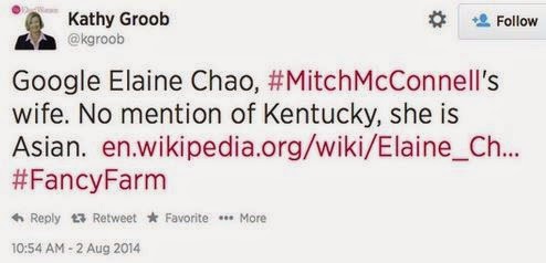 Kathy Groob is a Democrat Party stategist in Kentucky, where Republican Sen. Mitch McConnell is fighting for re-election against Democrat Alison Grimes. Saturday, in a complete non sequitur, Groob sent out a series of Twitter messages saying that McConnell’s wife, former Labor Secretary Elaine Chao, “isn’t from KY, she is Asian.”