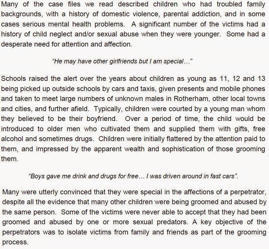 The modus operandi of pimps is well-known, and certainly no social worker or police officer can be ignorant of this. But carefully read these accounts of two victimized Rotherham girls from pages 44-45 of Professor Jay’s investigative report:
