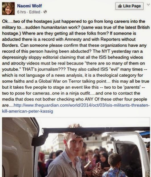 Naomi Wolf should go to Syria herself and find out if those ISIS videos are staged. http://t.co/0nzwjhEWXT (Hint: Buy a one-way ticket.)