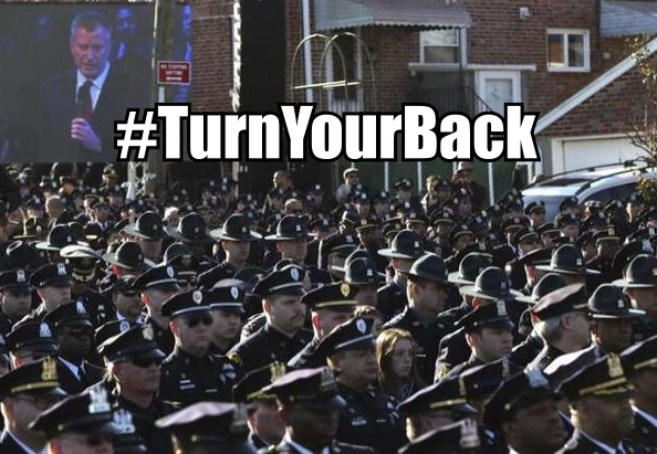 NEW YORK (AP) — Hundreds of officers outside the church where a funeral was held for a policeman killed along with his partner in an ambush shooting turned their backs on the mayor as he spoke during Saturday’s service.