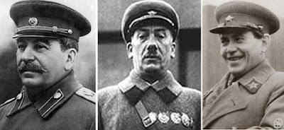 Left to right: Josef Stalin, Genrikh Yagoda, Nikolai Yezhov.