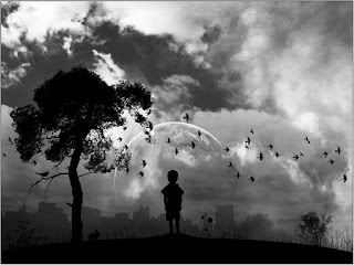 Granpda had a vision of his last look at the city. The hugest moon he’d ever seen, obscured by unnatural clouds. Bombers. A distant enemy had visited. A murder of ravens deployed from a lonely tree for the sudden necropolis.