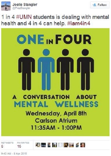 “Joelle Stengler reports that 25 percent of University of Minnesota students have mental health problems, and college-age women are particularly prone to these disorders.” So why, if college-age women are particularly prone to mental health problems, do they use a graphic with generic men?