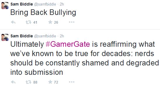 It was you, Max, who supported Sam Biddle when he celebrated the “bullying” of gamers and declared “nerds should be constantly shamed and degraded into submission.” Yeah, Max, I’m sure you and your buddies at Gawker laughed it up at that little joke, while you were congratulating yourselves on your “editorial integrity.” And as for those “misogynists and bigots” you contemptuously dismissed?