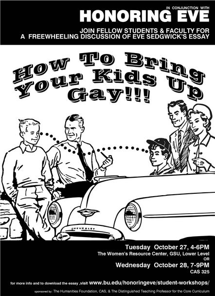 Faculty moderators held two workshops for undergraduate and graduate students on Sedgwick’s 1991 essay “How to Bring Your Kids Up Gay: The War on Effeminate Boys.” This short, accessible text focused attention on the alarming rate of suicide among gay and gender non-conforming youth, and critiqued the failure of psychotherapists in the US to address this crisis with queer-affirmative interventions.
