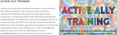 LGBTQ 101 is a two-hour long interactive presentation, designed to provide participants with a basic understanding and greater awareness of issues faced by students who identify as lesbian, gay, bisexual, transgender, or questioning (LGBTQ) within today’s culture. This presentation includes an overview of the Catholic church’s teachings on sexual orientation, definitions related to sexual orientation and gender identity, introduction to the concepts of homophobia and heterosexism, as well as common myths and misunderstandings about lesbian, gay, bisexual, and transgender identities. Please contact Maureen McKenney, Assistant Director for LGBTQ Student Concerns (mmckenney@nd.edu), for more information or to sign up for a session.