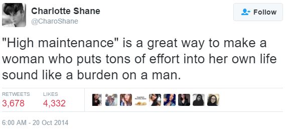 McHenry only got suspended a week for her abusive behavior — she just had “an intense and stressful moment,” she said — when anyone who wasn’t young, blonde and beautiful probably would have been fired. She’s in the TV business, you see, and TV needs beautiful young blondes, a market demand that confers lucrative advantages on those who are the supply of this valuable commodity. At any rate, I cite the example of Britt McHenry merely to point out that to me, the phrase “high maintenance” has a connotation, describing a certain bratty personality type. So when I encountered Charlotte Shane claiming that “high maintenance” refers to “a woman who puts tons of effort into her own life,” I was puzzled.