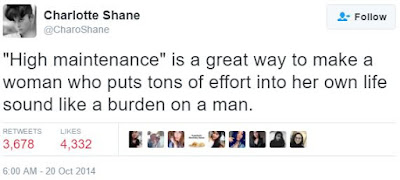What does “high maintenance” mean? This isn’t a phrase I often use, because I got married in 1989 and the phrase “high maintenance,” used as a pejorative against women, wasn’t commonplace when I was dating. However, from the way younger men use it, I’ve always thought of “high maintenance” as roughly synonymous with spoiled. To call a woman “high maintenance” is to imply she is a certain familiar type.