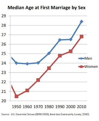 This social script has been torn to tatters in the past 40 or 50 years. In 1973, the median age at first marriage for U.S. women reached 21 for the first time in more than two decades, and has continued rising steadily — to 23 in 1980, to 24 in 1991, to 25 in 1998. The median age at first marriage for men, meanwhile, increased from 22.8 (in 1966) to 27.1 (in 1996). What this means, culturally, is that adolescence has been extended and adulthood has been postponed, so that the typical 25-year-old American man nowadays is more irresponsible and immature than his grandfather was at the same age, and this postponement of maturity has social consequences — sometimes deadly consequences.