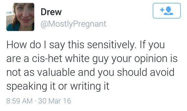 “How do I say this sensitively. If you are a cis-het white guy your opinion is not as valuable and you should avoid speaking it or writing it.”