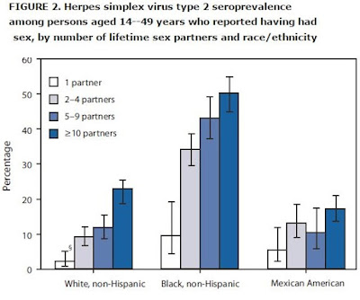 While it is true that anyone could become infected the first time they have sex, if their first partner already has the disease, anyone proficient in basic arithmetic can see that a combination of caution and a knowledge of risk factors can greatly decrease the likelihood of getting herpes. In 2010, the CDC reported that the herpes rate “was nearly twice as high among women (21%) as men (11%), and more than three times higher among African-Americans (39%) than whites (12%). The infection rate among African-American women was 48%.” For obvious reasons, risk is correlated with the number of sexual partners you have. The CDC found that about 27% of those who reported 10 or more partners during their lifetime are infected with herpes, whereas the rate was only 4% among people who reported having had just one sex partner ever. In other words, the difference between having one partner and having 10 or more partners is a 675% increase in your risk of contracting herpes.