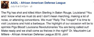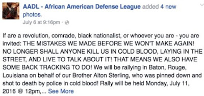 We have no alternative! We must kill white police officers across the country! . . . Across the country, the nation, the Blackman is being assassinated/killed like dogs! Unarmed Blackmen being shot down like animals. Two legged dogs sicking four legged dogs on our black children, young men, young women, and our black elderly. Shooting black folks down like rabid animals. We must kill the one in blue who is killing me and killing you! We must kill the white policeman across the country! We must hide in the darkness of the night and kill the white policeman across the country!