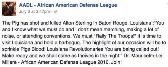 Mauricelm-Lei Millere is leader of the African American Defense League (AADL), which has repeatedly advocated violence against police. Dallas gunman Micah Xavier Johnson supported the AADL on Facebook, where Millere’s group posted messages that declared “ATTACK EVERYTHING IN BLUE EXCEPT THE MAIL MAN” and “sprinkle Pigs Blood” prior to Thursday’s attack. On his Instagram page, Millere wrote: “We have no alternative! We must kill white police officers across the country!”