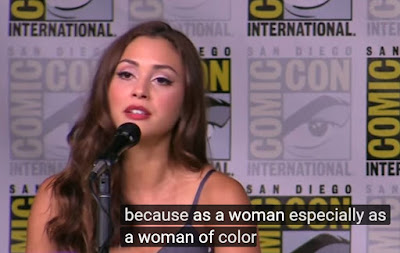 Finally, the question went to Lindsey Morgan, who plays Raven on the series. She answered: “I personally am extremely grateful because as a woman, and especially as a woman of color . . .” Some women in the audience began whooping, and Morgan shouted: “Yeah!”