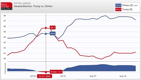 . . . clearly recent polls have shown Trump falling behind. He led for four days (July 25-28) in the Real Clear Politics average of national polls. That lead peaked with Trump at 45.7 to Clinton’s 44.6. As of today, Clinton leads by a full six points, 47.2 to Trump’s 41.2, so that in the past three weeks, there has been a net 7-point swing from Trump to Clinton. Fortunately for Trump, it is still early — most people ignore the election campaign until after Labor Day — and Clinton’s negatives are quite high. The Trump campaign just now began making its first advertising buys in major battleground states, and we shall see what effect a new management team has. Those who thought Trump’s campaign was doomed to defeat may yet be proven wrong.