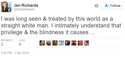 You have to wonder what psychological defect would inspire transgender activist Jen Richards to send out a tweet suggesting that “extraordinary” men are rare, while “extraordinary” women are everywhere. Given that Richards is not actually female, how does this appear — that is, to people who aren’t as reflexively anti-male as Richards, like the nearly 3,000 feminists who retweeted that particular message of hatred?