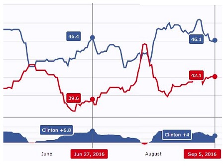 In recent days, Hillary Clinton’s poll lead over Donald Trump has begun shrinking again. In two recent polls — by Investors Business Daily and Reuters — Hillary led by just one point, and in the latest L.A. Times poll, Trump is actually leading by 2 points, 45%-43%. The trend in the Real Clear Polls average of national polls is clear — Hillary’s lead, which was nearly 8 points just three weeks ago, has now been cut in half.
