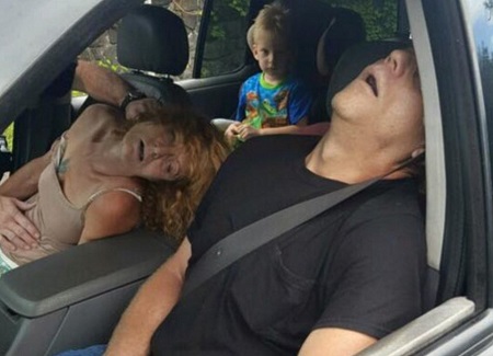 A police department in Ohio has shared on Facebook disturbing photos of a man and woman passed out in a car with a toddler in the backseat after the pair had allegedly overdosed on heroin.
