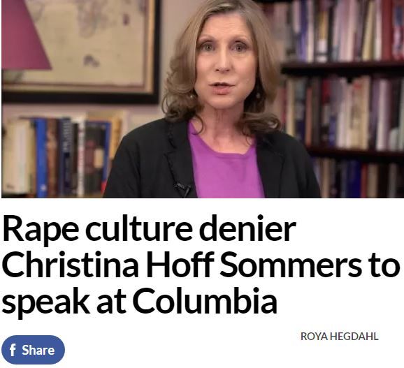 Sunday, I took notice of a controversy at Columbia University, where feminists tore down posters announcing a scheduled Nov. 1 speech by Christina Hoff Sommers. In researching this incident, I discovered that Columbia senior Roya Hegdahl had incited hatred against Dr. Sommers by labeling her a “rape culture denier.”