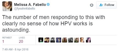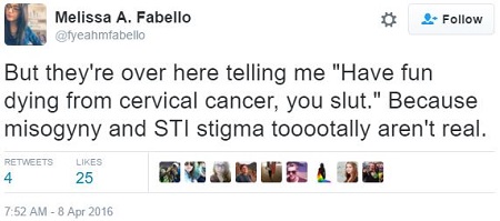 You remember Melissa Fabello (@FYeahMFabello on Twitter), managing editor of the LGBTQIA site Everyday Feminism. She is the queer woman who hates white people, heterosexuality and men, not necessarily in that order. She is also notorious for being infected with human papillomavirus (HPV), a sexually-transmitted disease otherwise known as genital warts.