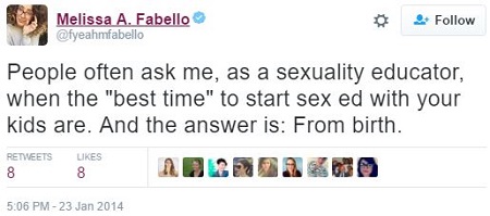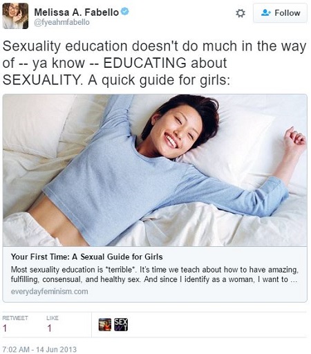 So you see that queer feminist Melissa Fabello likes talking to girls — young girls, in sixth or seventh grade — about sex. Because she’s a “sexuality educator,” and obviously it’s important to have professionals do this crucial job of, uh, talking to young girls about sex.