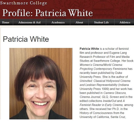 Professor Patricia White is the Program Coordinator of Gender and Sexuality Studies at Swarthmore. Professor White is author of Uninvited: Classical Hollywood Cinema and Lesbian Representability, a 1999 book from page 5 of which we shall quote this two-sentence sample: