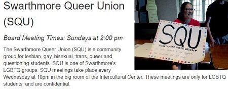 Yes, there are “a lot more spaces for everything else” at Swarthmore, none of which seem to involve sanity or heterosexuality. Swarthmore’s office of Counseling and Psychological Services provides “free, voluntary, confidential psychological individual and group counseling to students,” and has a staff of 11 employees, or about one counselor for every 145 students on campus. The staff psychologists must be overworked because, let’s face it, you’d have to be crazy to go to Swarthmore and your parents would be crazy to spend $63,550 a year to send you there. If your kid is a deranged lunatic (cross-dressing, masturbating in public, babbling gibberish about “queer theology,” etc.) just call 911 and have them committed to the state mental asylum. Problem solved, no cost to you.