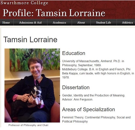 The faculty of Gender and Sexuality Studies at Swarthmore includes Professor Tamsin Lorraine, who is also chair of the Philosophy department. Her doctoral dissertation, Gender, Identity, and the Production of Meaning, was published in 1990 and is described thus: