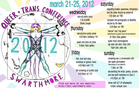 Swarthmore College’s annual Queer and Trans Conference (QTC) is a student-run, free, and public conference that explores critical topics of queer and trans thinking, playing, working, organizing, and living. . . . We invite a diverse group of presenters who will help us to re-center queer and trans discourse around voices and perspectives marginalized by mainstream gay rights movements. . . .