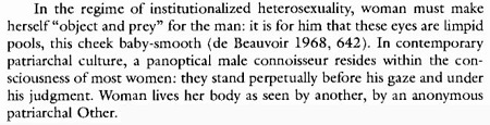 Read in context, Professor Bartky’s quote condemns heterosexuality as an oppressive “regime” in which every woman is “prey” of the “patriarchal other” (i.e., men) whose “gaze” is imposed on her “consciousness.”